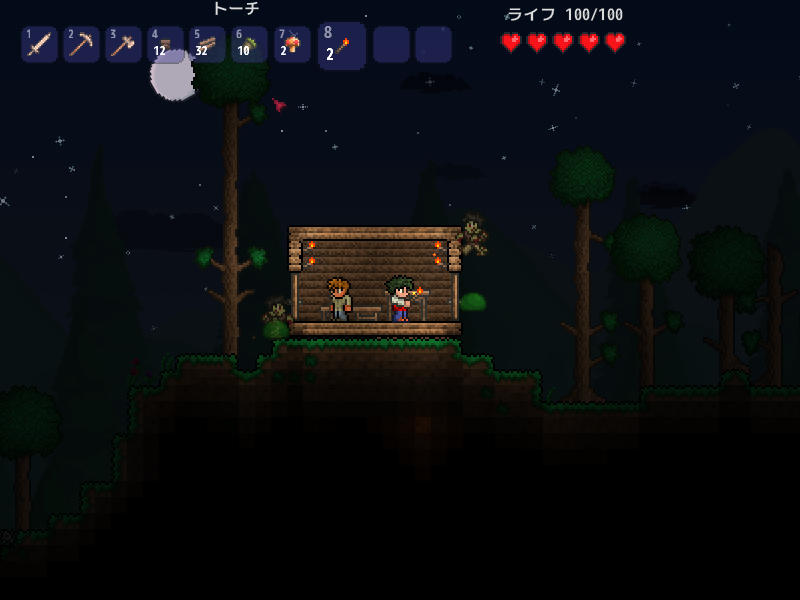 ハイッ!伐採した木材をつかって、枠を作りました。とりあえずこれでもうモンスターに襲われません。少し安心です。ちなみにTerrariaでは、横10×縦6以上無いと部屋としてみなされないらしいので、とりあえずそれを基準に作っています。左隅が浮いてますが気にしないよ。