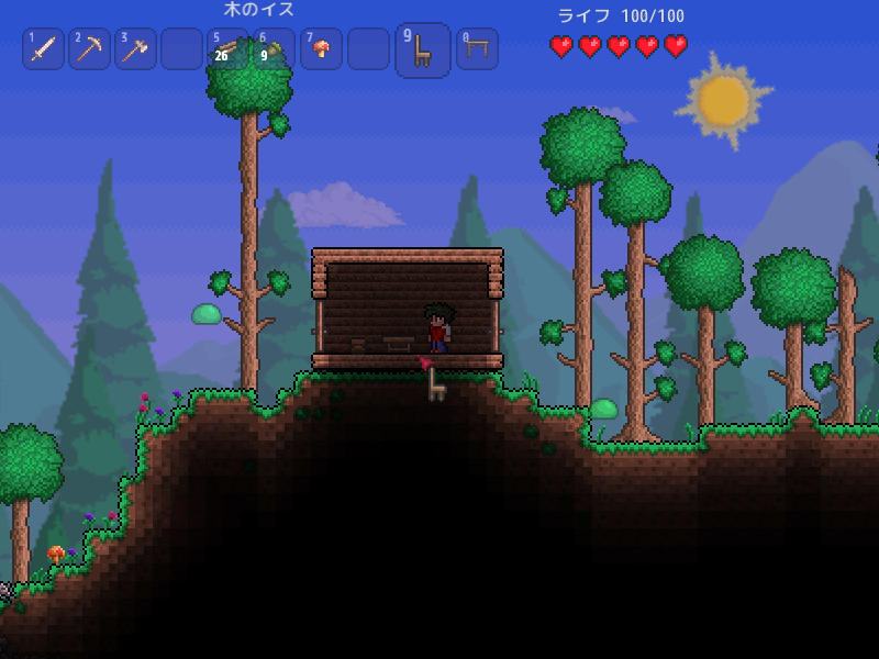 机や椅子や、木の壁が作れるようになります。もっかい言うけど、Terrariaでは、壁と、灯りと机と椅子が無い部屋は部屋としてみなされないので、家具、大事です。