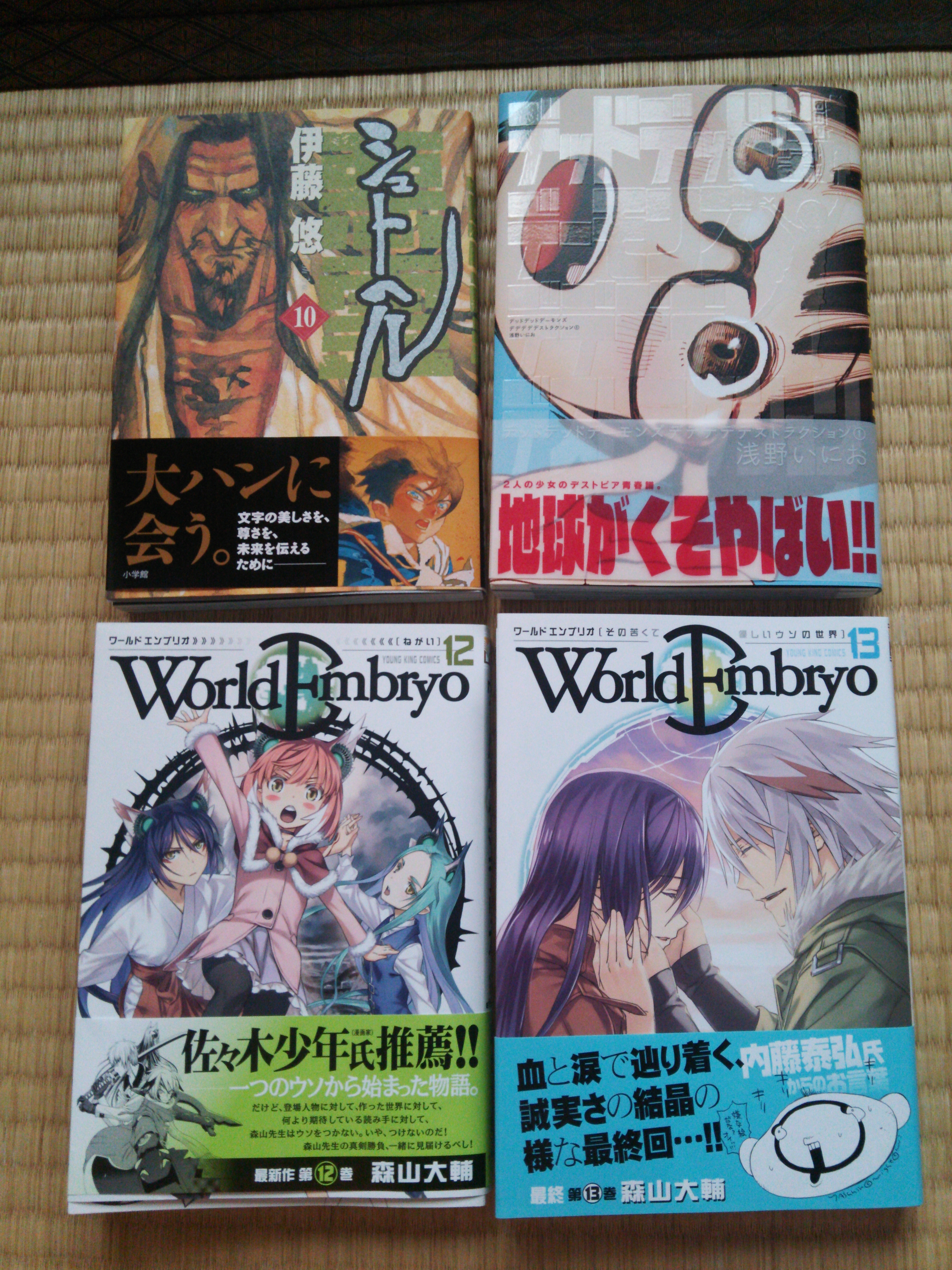2014年10月5日 BLEACH (65)買ってきた。 んー、あー、まあ、いつも通りだなって思って読んでいたら、 589話の井上さんと夜一さんが全部持って行った。からの、涅隊長。次巻涅無双かしら、楽しみだなあ。 あとは、先週は、シュトヘル(10)と、ワールドエンブリオ(12)(13)、デッドデッドデーモンズ デデデデデストラクション(1)買った。 ワールドエンブリオは完結した。良かった。ちゃんと終わってよかった。 デッドデッドデーモンズ デデデデデストラクション(1)は、相変わらずの浅野いにおっぷりだった。面白いw