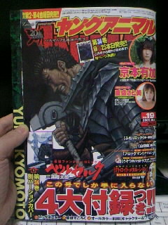 2009年9月30日 ヤングアニマル No.19 普段はコミック誌は基本的に買わない俺ですが、ヤングアニマル No.19を買ってしまいました。 なぜなら!ベルセルクの第34巻別バージョンカバーが付録だったから!悔い無し!