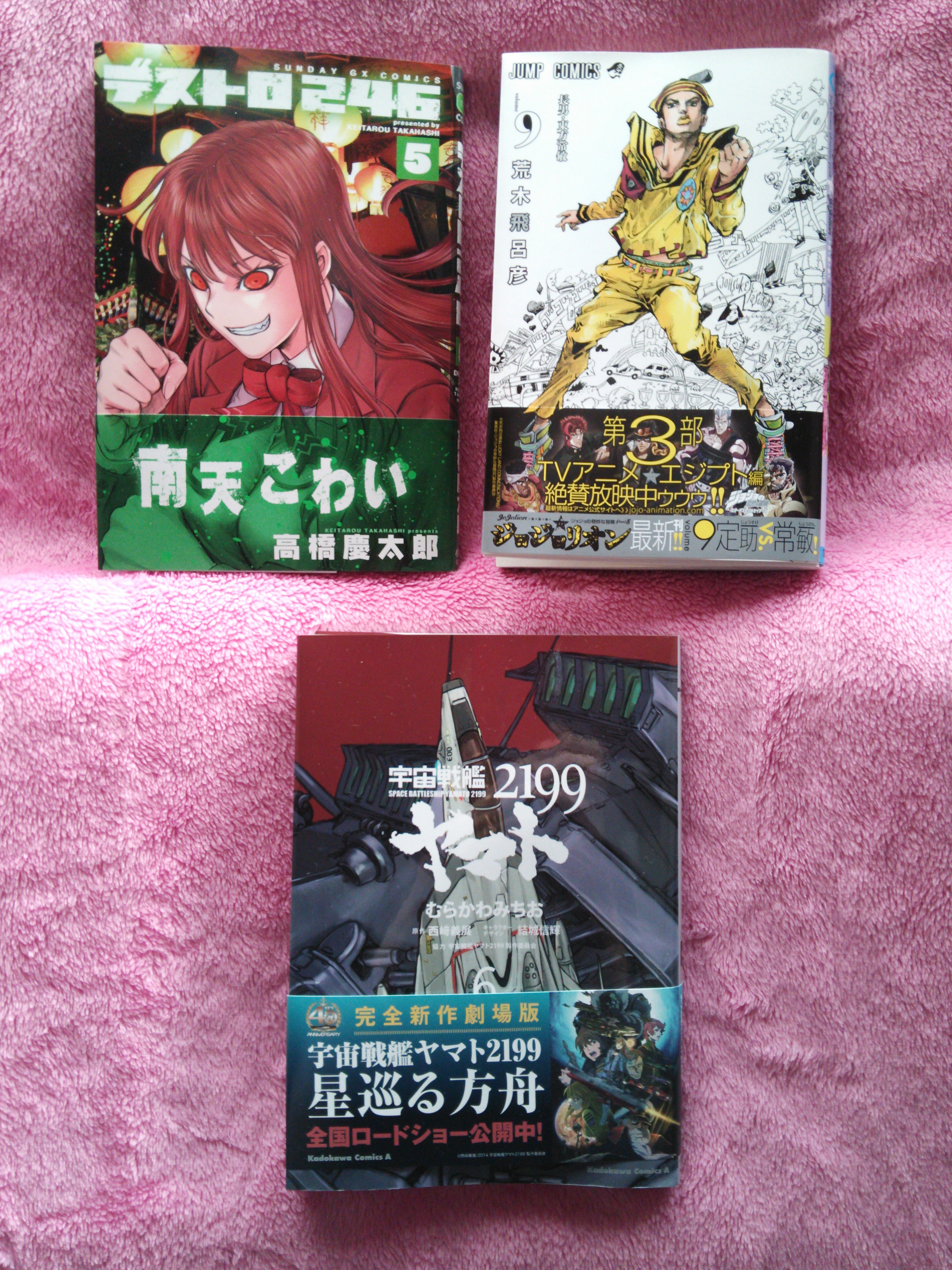 2015年2月22日 デストロ246(5)買ってきてた 殺し屋女子高生ズ、こえー なんていうか、目がこわいw あとジョジョリオン(9)と、先月買い忘れてた宇宙戦艦ヤマト2199 (6) 荒木先生の著者近影、全然老いてなくてこわいw 宇宙戦艦ヤマトの女子クルーの制服、ピッチリしてて好きだなー、今回もいい話。