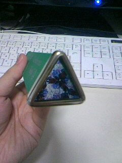 2009年10月18日 万華鏡 先日箱根に行ってきたお袋から、箱根土産に万華鏡をもらいました。箱根ガラスの森っていうのがあるんですって。この万華鏡、三角形になってるんだよねー、まあそもそも万華鏡って丸いけど中の鏡は言われてみれば三角形になってた気はする。子供の頃から万華鏡ちょっと好き。クルクル